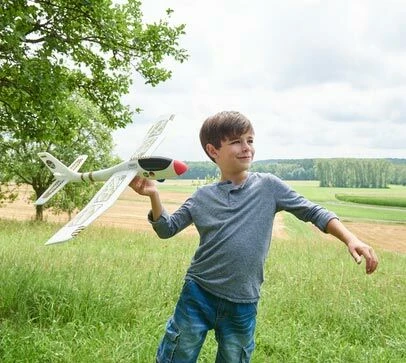Speelplezier in een loop: neem het vliegtuig bij de romp onder de vleugels tussen de duim en de wijsvinger vast, lanceer het met een grote zwaai en laat het snel en sierlijk door de lucht zweven.