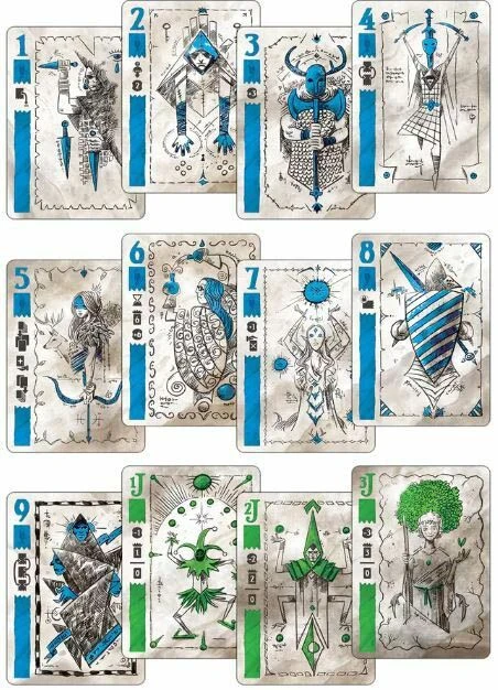 Het kaartspel Thrones of Valeria bestaat uit vijf kleuren kaarten (genummerd zijn van 1 tot 9) en speciale narren. De kaarten hebben een speciale kracht die invloed heeft op het verloop van de spelrondes. Op het klassementbord wordt de prestige bijgehouden.