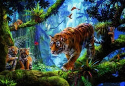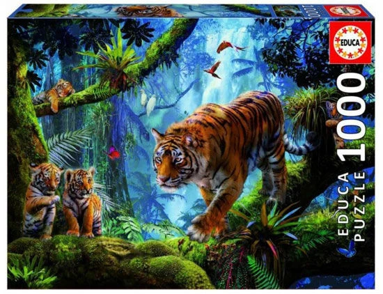 Dit is een heel mooie legpuzzel met tijgers. Je ziet een volwassen tijger en 4 welpen in een boom. De puzzel bestaat uit 1000 stukken en heeft een afmeting van 68 x 48 cm.