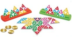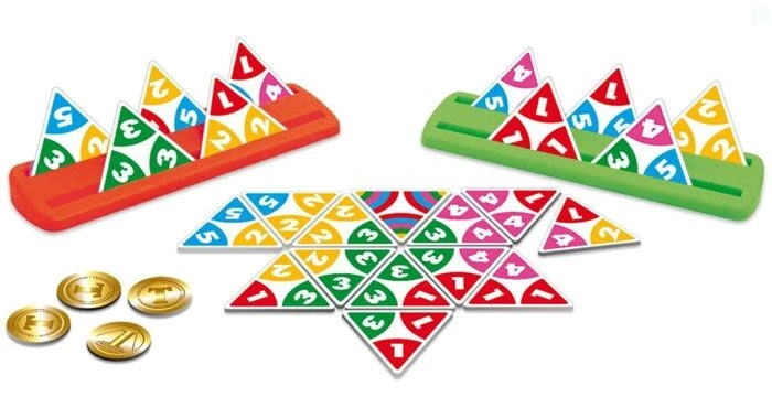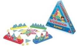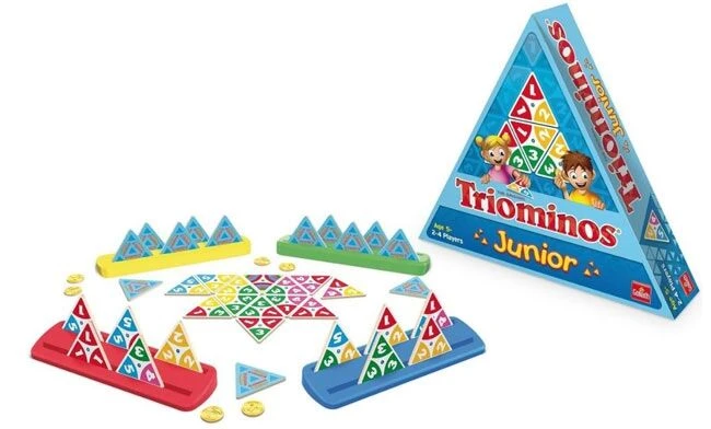In het spel Triominos Junior probeer je zo veel mogelijk beloningsfiches te verdienen door de juiste kaartjes naast elkaar te leggen en toe te voegen aan reeksen die er al liggen.
