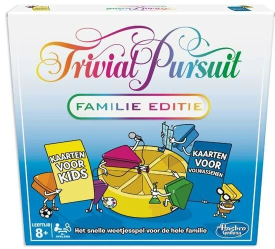 Het snelle weetjesspel voor de hele familie, met 2400 vragen. Haal iedereen bij elkaar voor een geweldige speelervaring! Deze Trivial Pursuit Familie Editie biedt nieuwe vragen en een lekker hoog tempo, plus de nieuwe Showdown Challenge, waarbij 2 spelers tegelijkertijd tegen elkaar spelen om een partje. Speel individueel of in teams. Verplaats om de beurt over het speelbord en win partjes als je de vragen goed beantwoordt. Dit leerzame spel boordevol speelpret is perfect voor een feestje en speciaal ontworpen voor families. Familieleden kunnen testen hoe slim ze zijn met een enorme hoeveelheid vragen in 6 categorieën: Aardrijkskunde, entertainment, geschiedenis, sport en vrije tijd, kunst en literatuur en natuur en wetenschap. Wees de eerste speler die één partje verzamelt voor elk van de zes categorieën en beantwoord een beslissende eindvraag om te winnen! Met Belgische vragen!