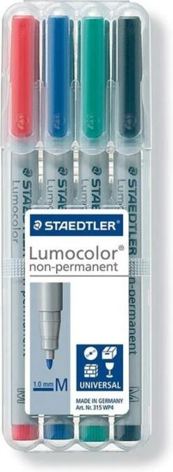 Dit zijn 4 uitwisbare stiften van het merk Staedtler: 1x zwart, 1x blauw, 1x rood en 1x groen. Het zijn universele pennen met een lijnbreedte M (= ca. 1,0 mm).