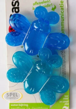 Deze verpakking bestaat uit twee met water gevulde bijtringen in de vorm van een vlinder, een lichte blauwe en een donker blauwe. Sommige delen van de bijtring zijn zacht en sommige zijn hard. Deze afwisseling en het reliëf in het materiaal zorgen voor variatie en verkenningsplezier bij baby. De bijtring kan gekoeld worden in de ijskast om eventuele pijn aan het tandvlees te verzachten.