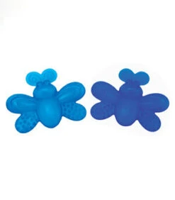 Deze verpakking bestaat uit twee met water gevulde bijtringen in de vorm van een vlinder, een lichte blauwe en een donker blauwe. Sommige delen van de bijtring zijn zacht en sommige zijn hard. Deze afwisseling en het reliëf in het materiaal zorgen voor variatie en verkenningsplezier bij baby. De bijtring kan gekoeld worden in de ijskast om eventuele pijn aan het tandvlees te verzachten.