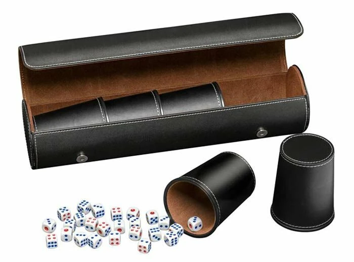 Deze koffer bevat vijf dobbelbekers, een deksel en 25 dobbelstenen. De dobbelbekers zijn gemaakt van zwart kunstleer.